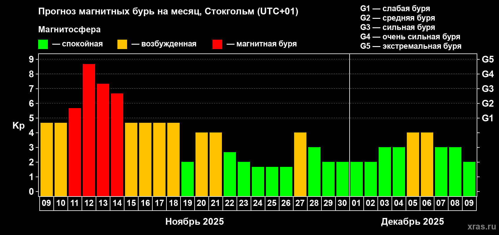 Прогноз магнитных бурь в Стокгольме — 9 ноября 2025 года
