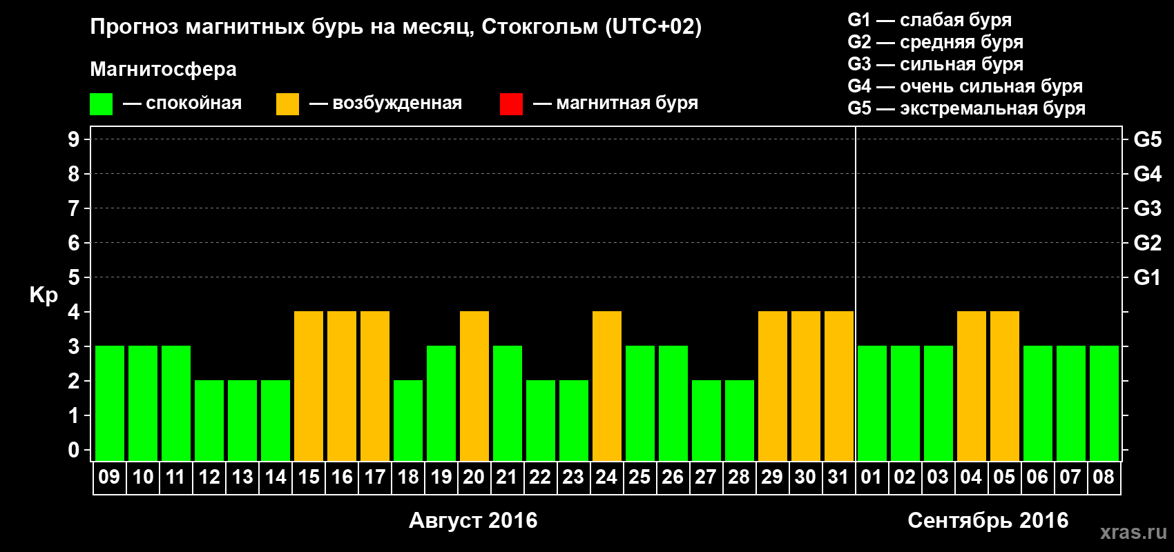 Прогноз магнитных бурь в Стокгольме — 9 августа 2016 года