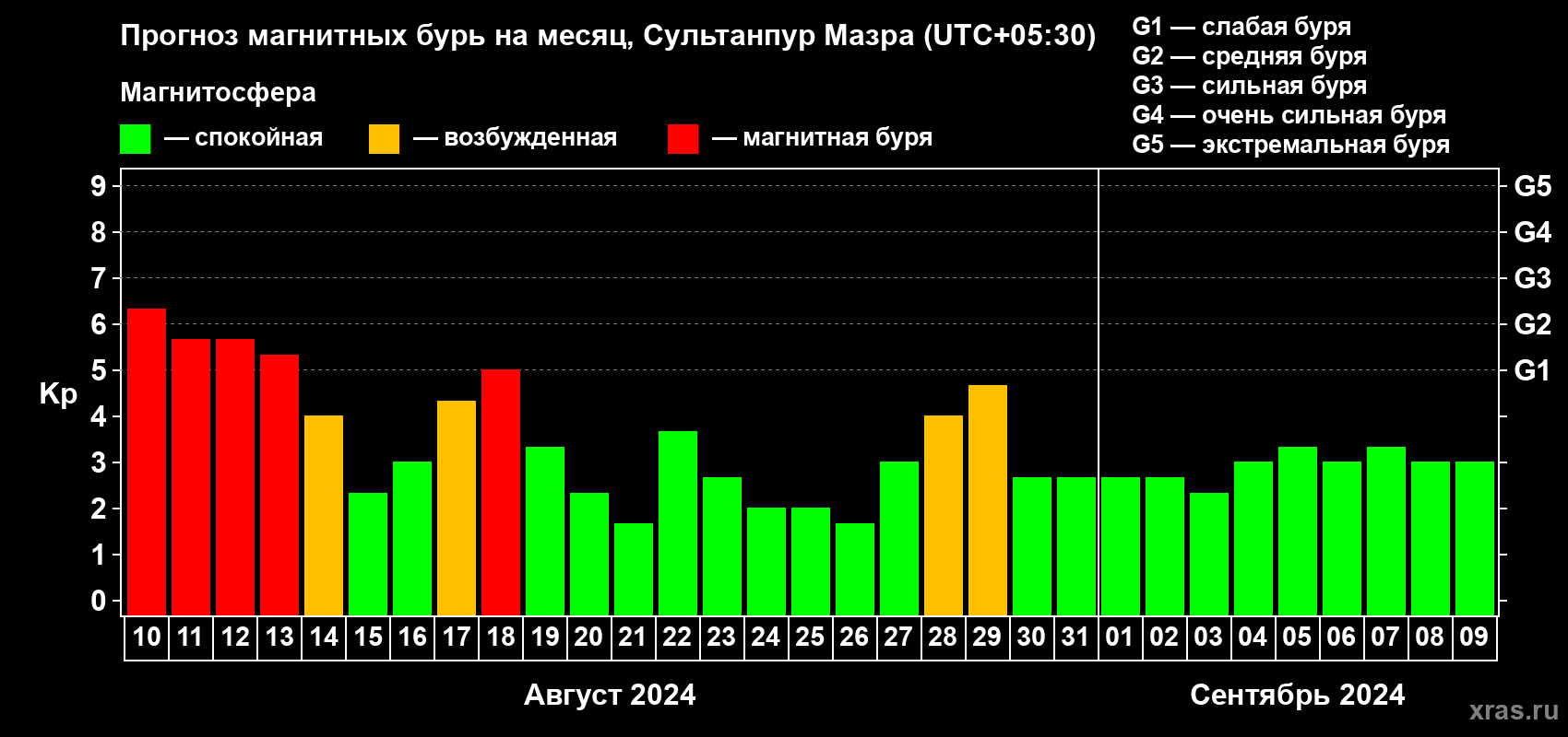 Прогноз магнитных бурь в Сультанпур Мазре — 10 августа 2024 года