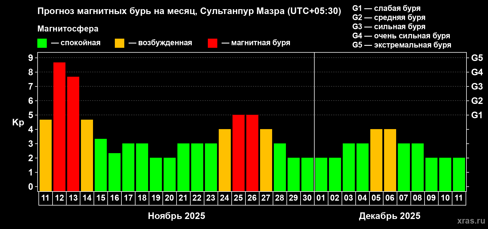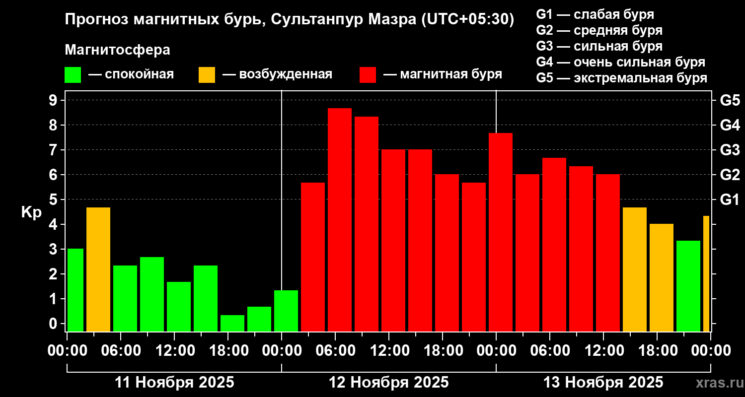 Прогноз магнитных бурь в Сультанпур Мазре — 11 ноября 2025 года