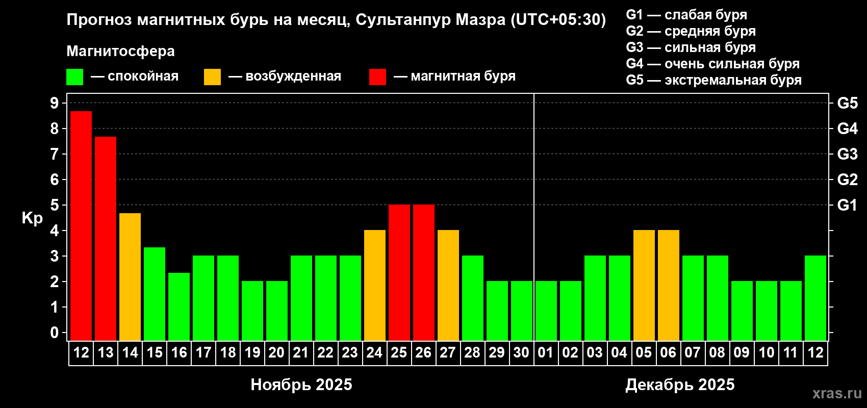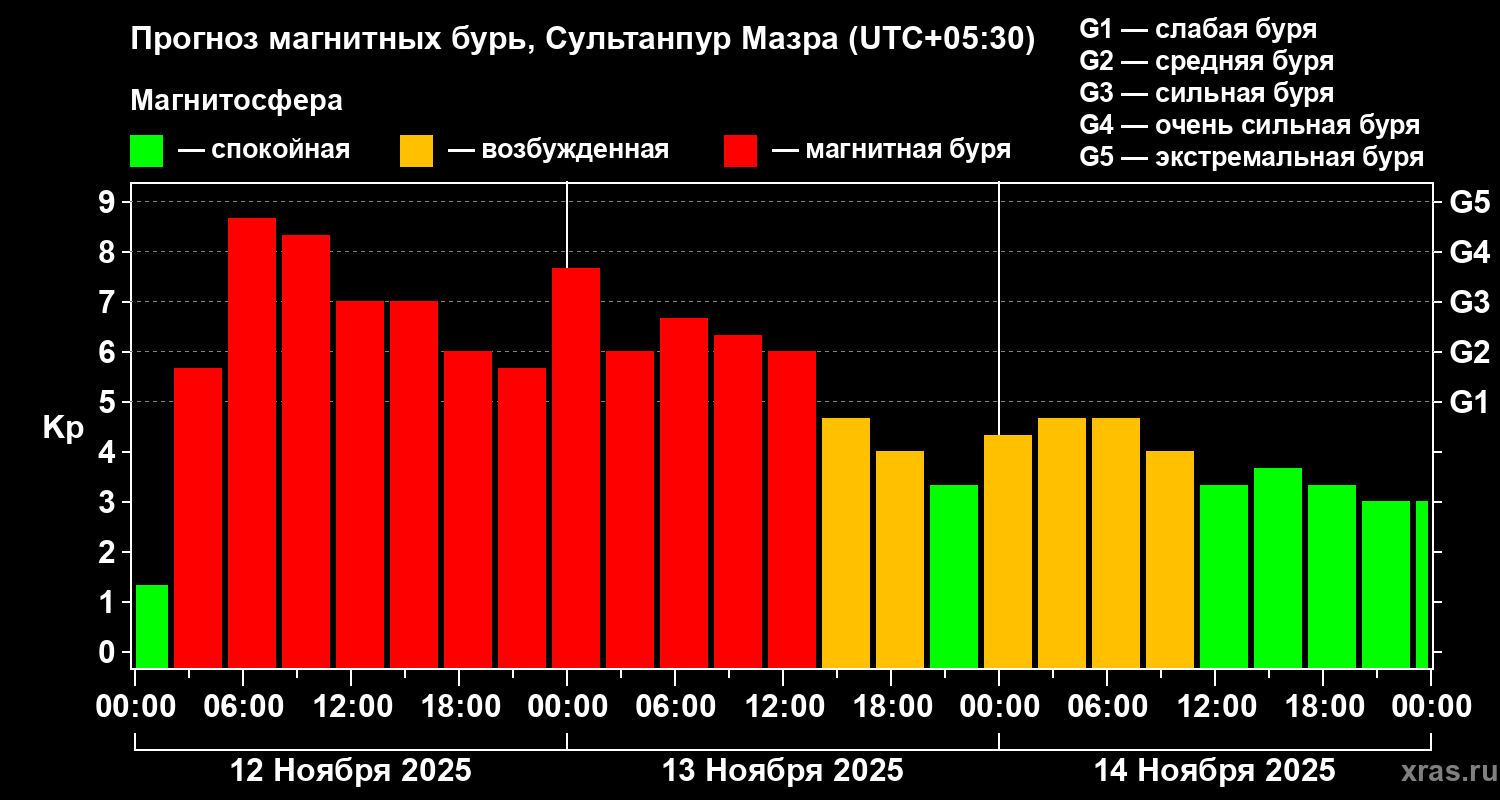 Прогноз магнитных бурь в Сультанпур Мазре — 12 ноября 2025 года