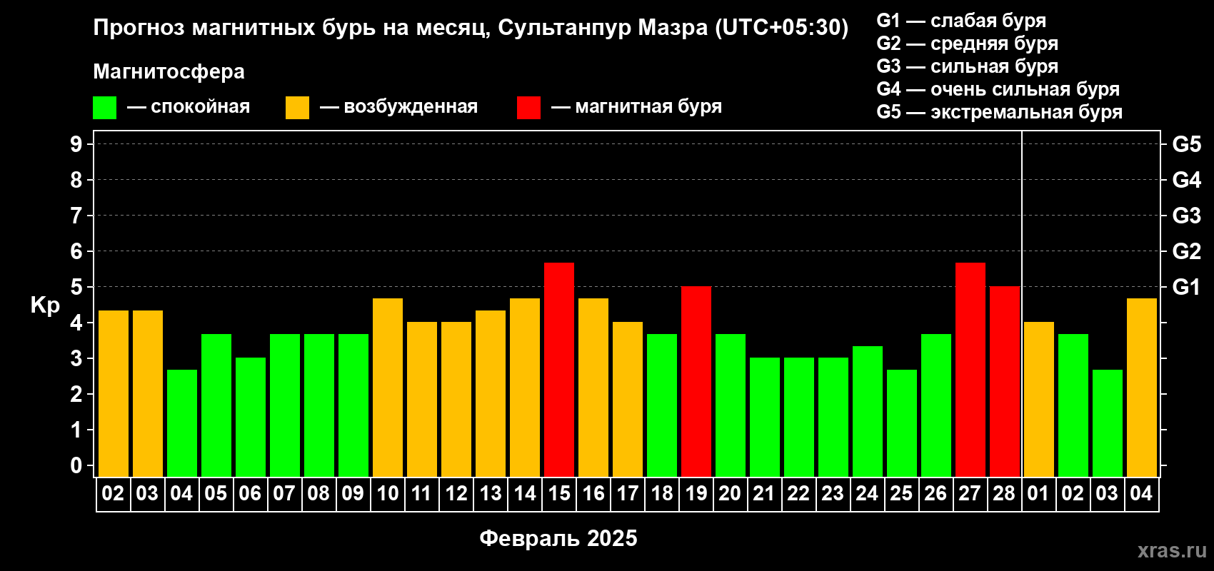 Прогноз магнитных бурь в Сультанпур Мазре — 2 февраля 2025 года