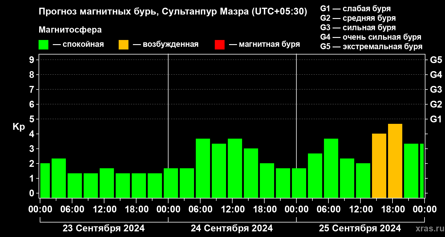 Прогноз магнитных бурь в Сультанпур Мазре — 23 сентября 2024 года
