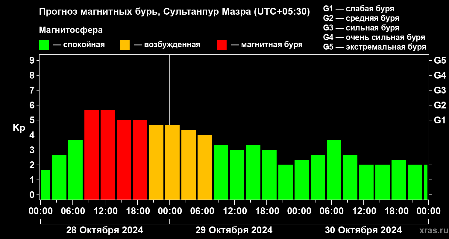 Прогноз магнитных бурь в Сультанпур Мазре — 28 октября 2024 года