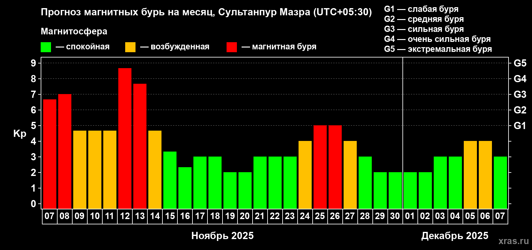 Прогноз магнитных бурь в Сультанпур Мазре — 7 ноября 2025 года