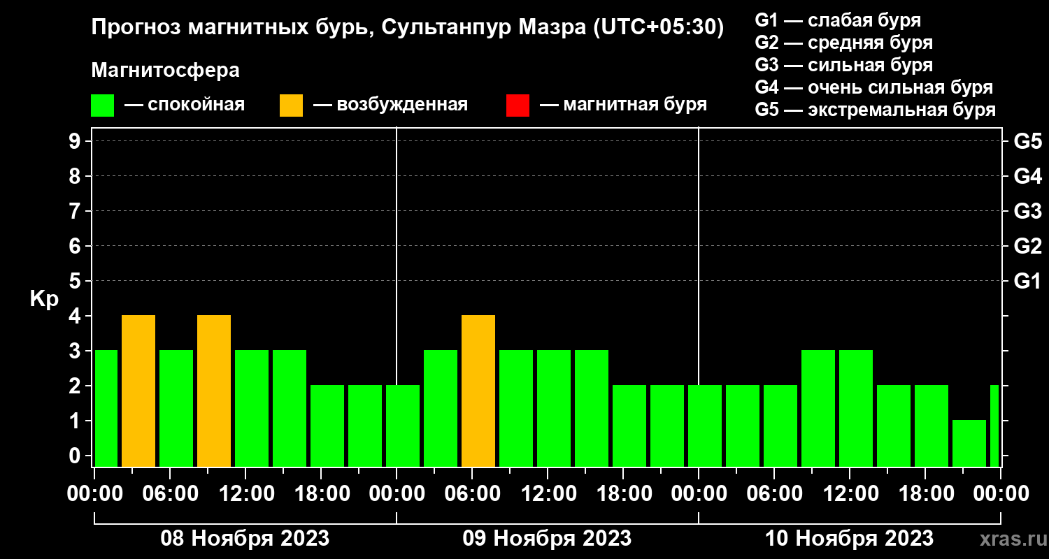 Прогноз магнитных бурь в Сультанпур Мазре — 8 ноября 2023 года