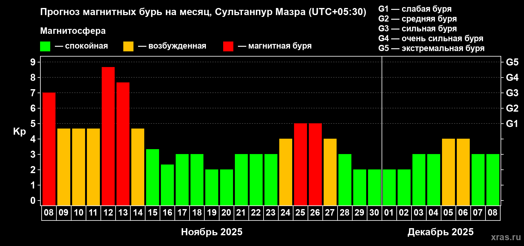 Прогноз магнитных бурь в Сультанпур Мазре — 8 ноября 2025 года