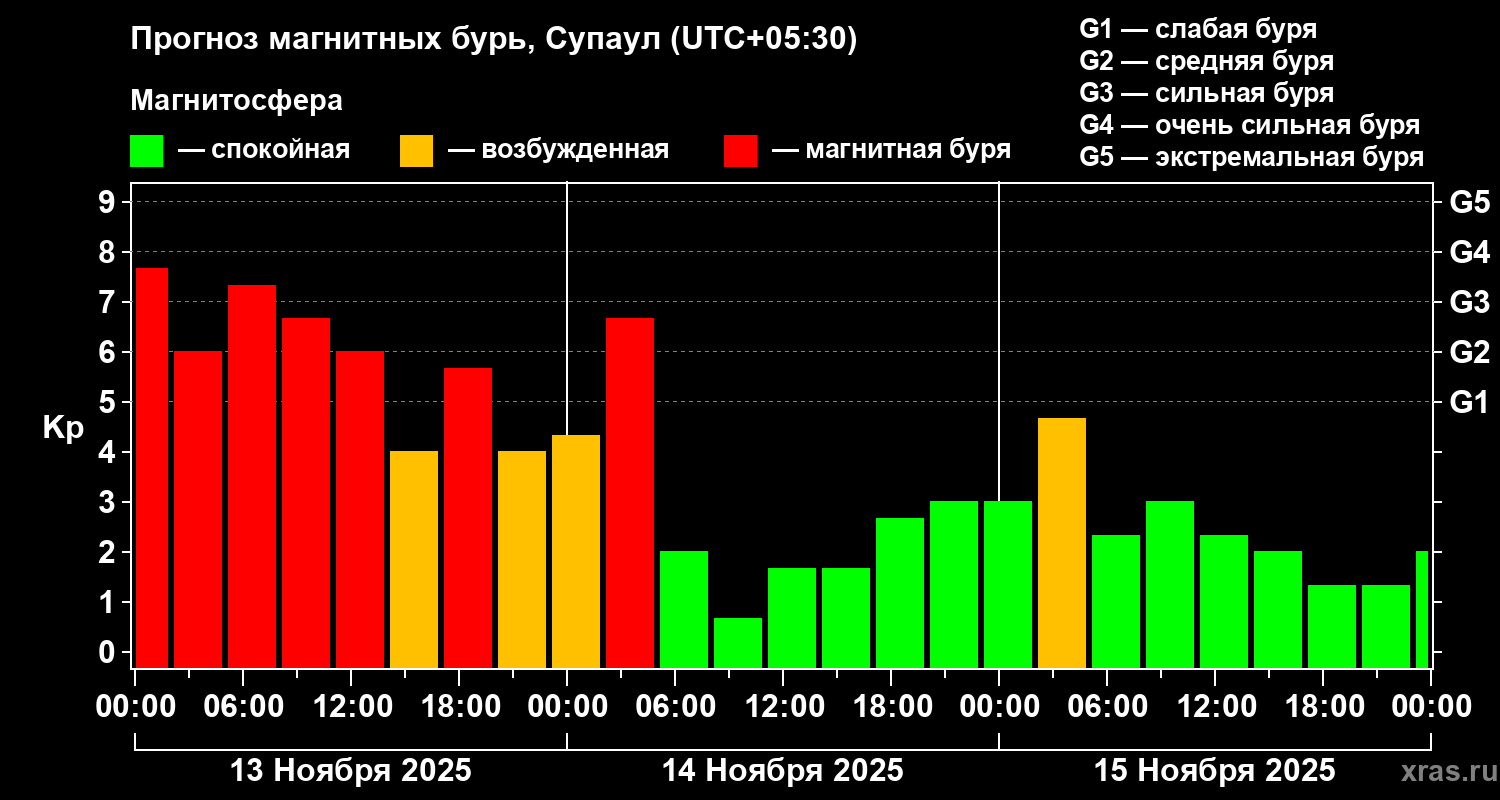 Прогноз магнитных бурь в Супауле — 13 ноября 2025 года