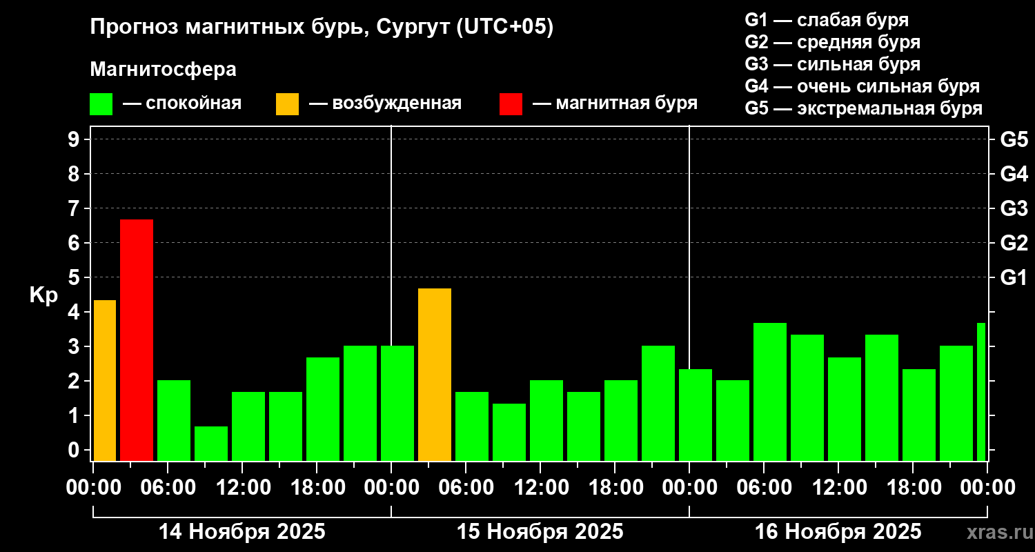 Прогноз магнитных бурь в Сургуте — 14 ноября 2025 года
