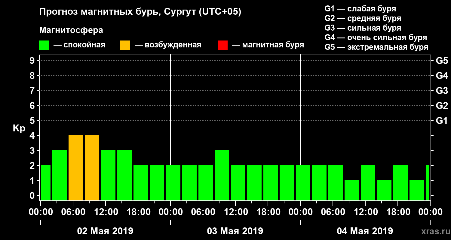 Прогноз магнитных бурь в Сургуте на 2 мая 2019 года