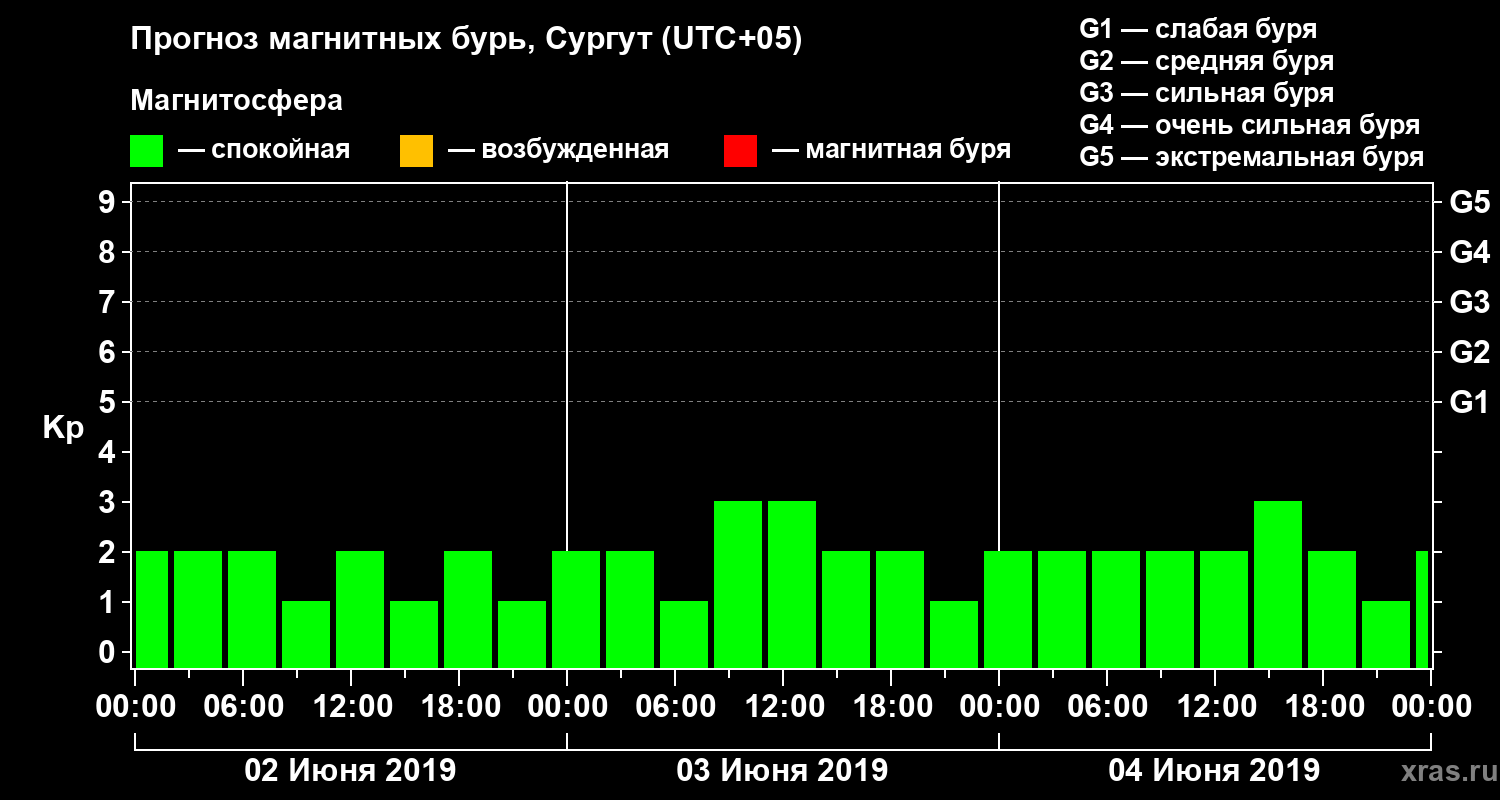 Прогноз магнитных бурь в Сургуте на 2 июня 2019 года