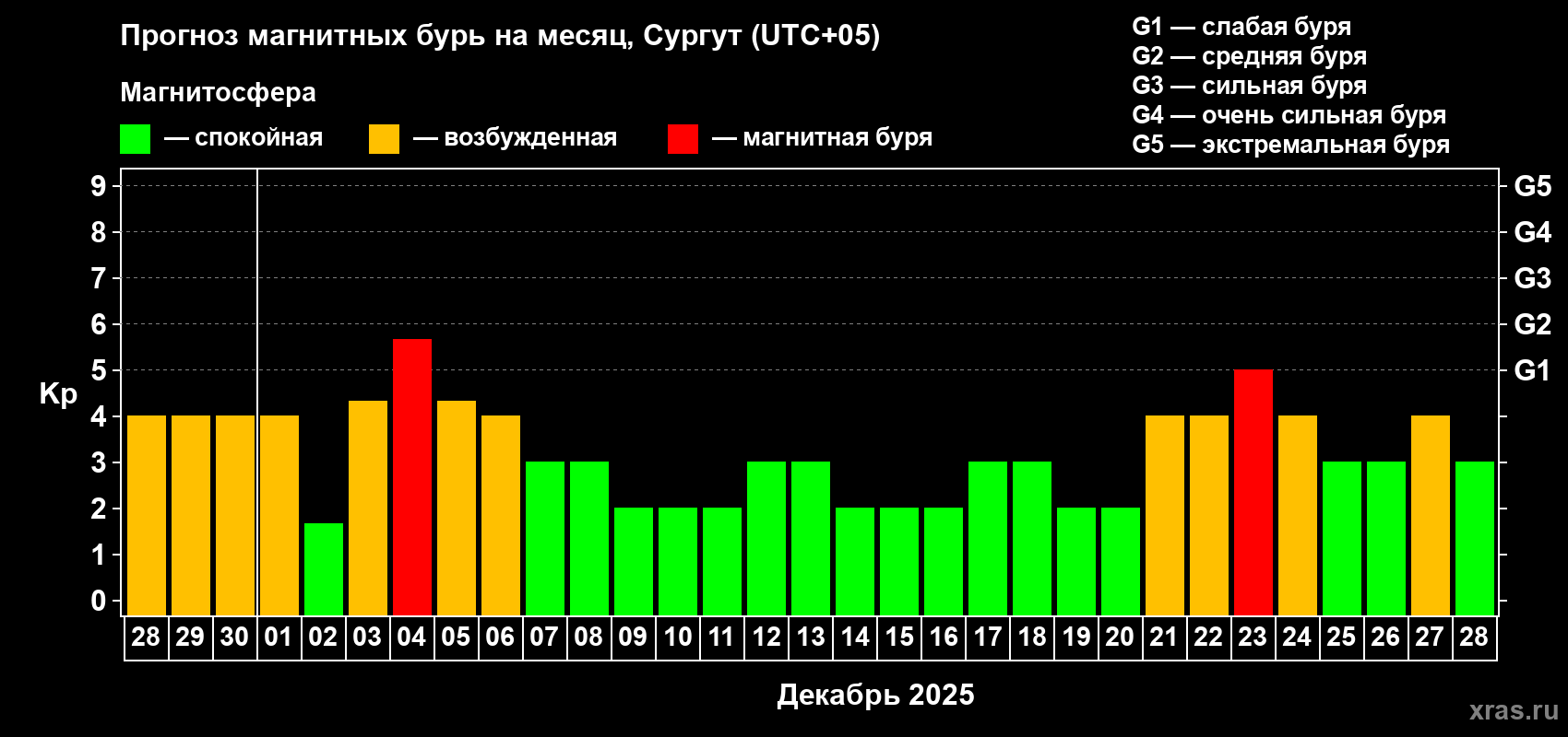 Прогноз магнитных бурь в Сургуте — 28 ноября 2025 года