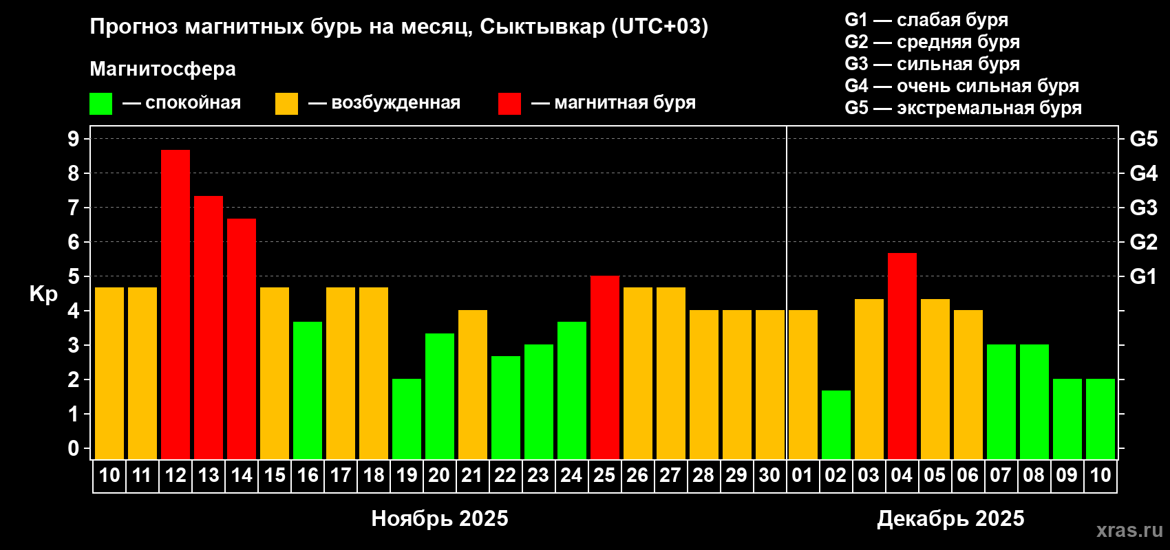 Прогноз магнитных бурь в Сыктывкаре — 10 ноября 2025 года