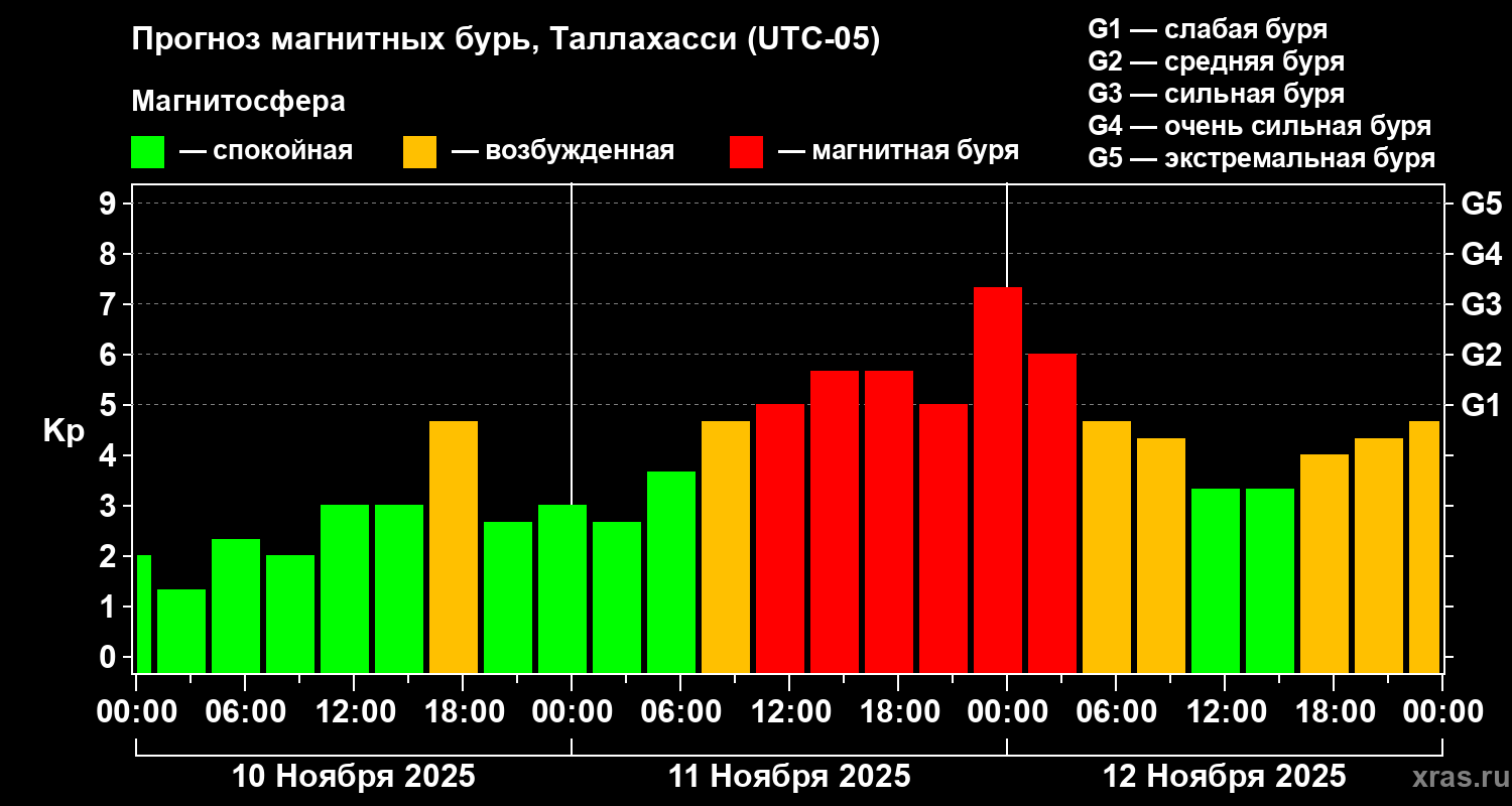 Прогноз магнитных бурь Таллахасси — 10 ноября 2025 года