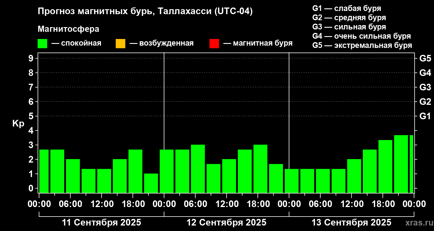 Прогноз магнитных бурь Таллахасси на 11 сентября 2025 года