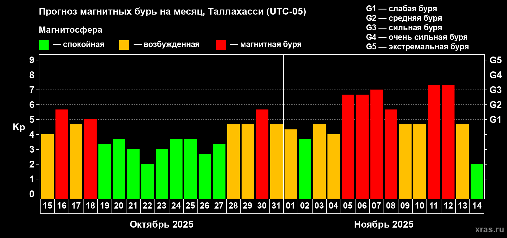 Прогноз магнитных бурь Таллахасси на 15 октября 2025 года