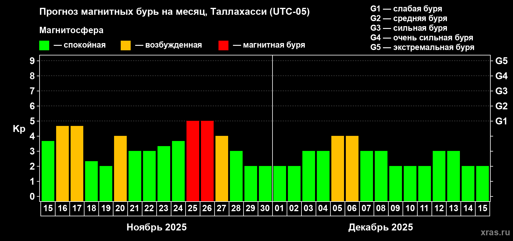 Прогноз магнитных бурь Таллахасси — 15 ноября 2025 года
