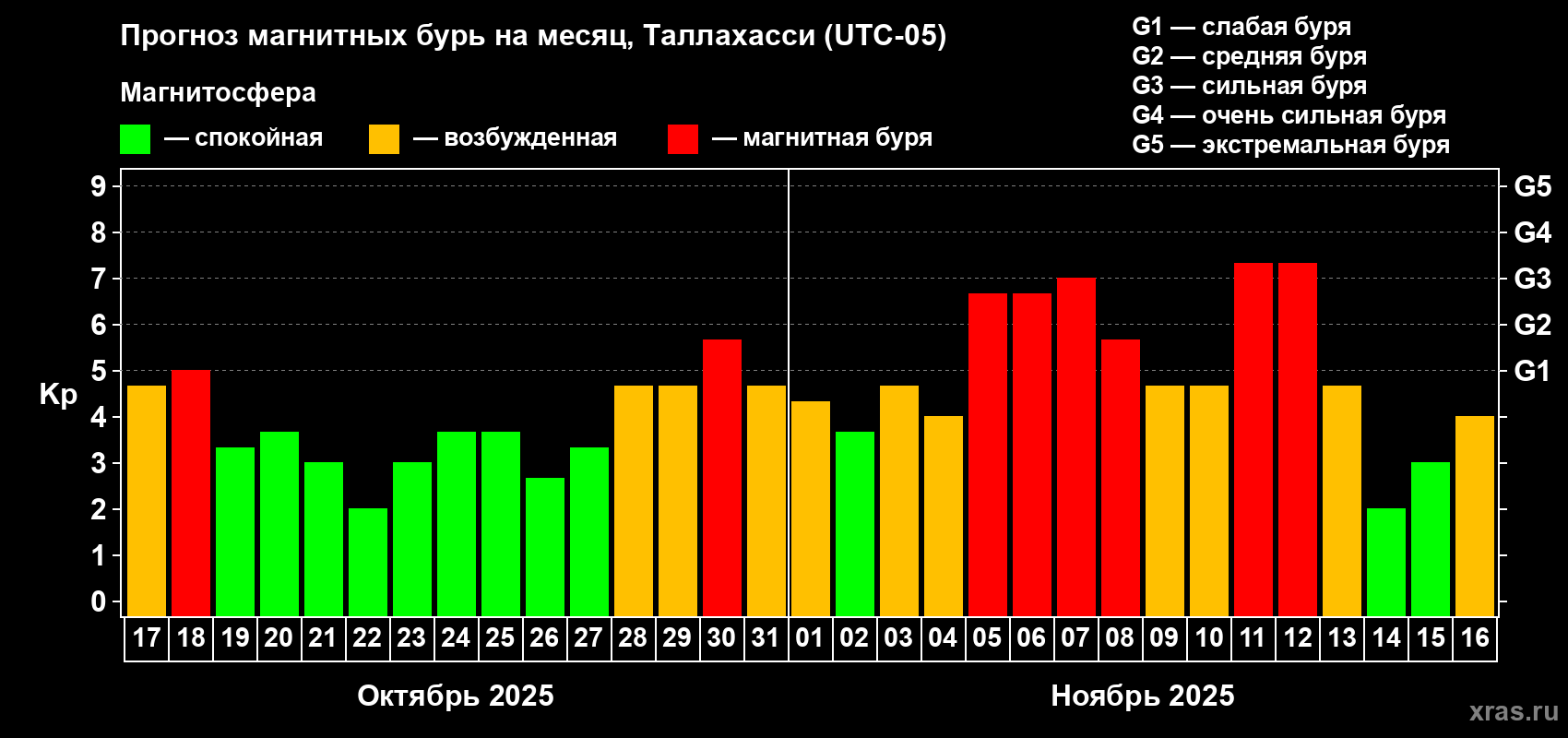 Прогноз магнитных бурь Таллахасси на 17 октября 2025 года
