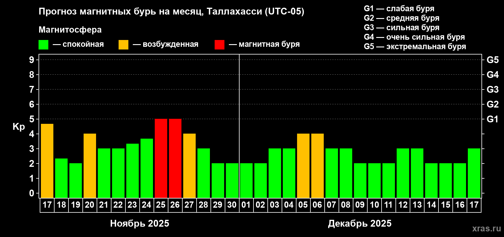Прогноз магнитных бурь Таллахасси — 17 ноября 2025 года