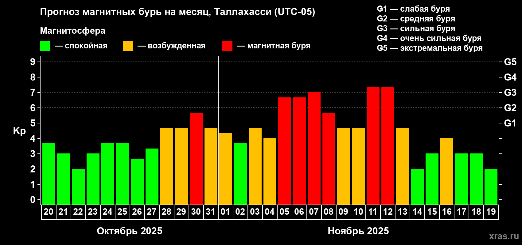 Прогноз магнитных бурь Таллахасси на 20 октября 2025 года