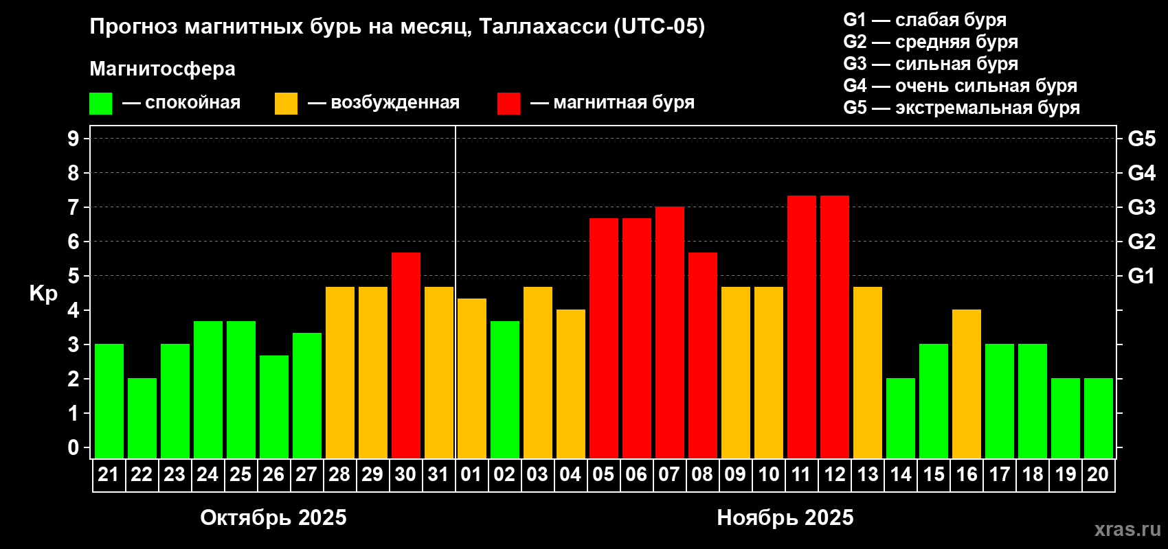Прогноз магнитных бурь Таллахасси на 21 октября 2025 года