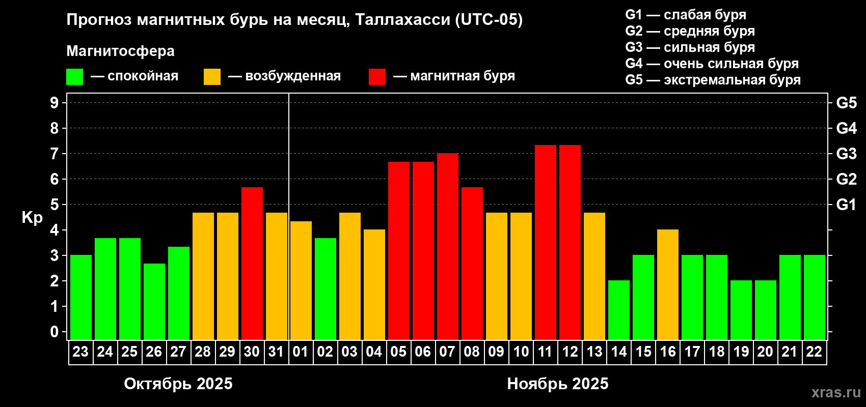 Прогноз магнитных бурь Таллахасси на 23 октября 2025 года