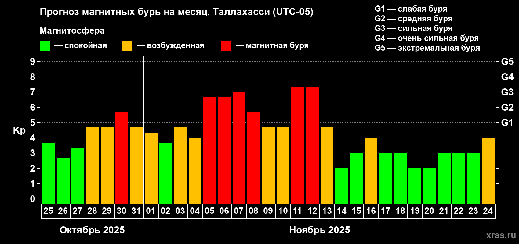 Прогноз магнитных бурь Таллахасси на 25 октября 2025 года