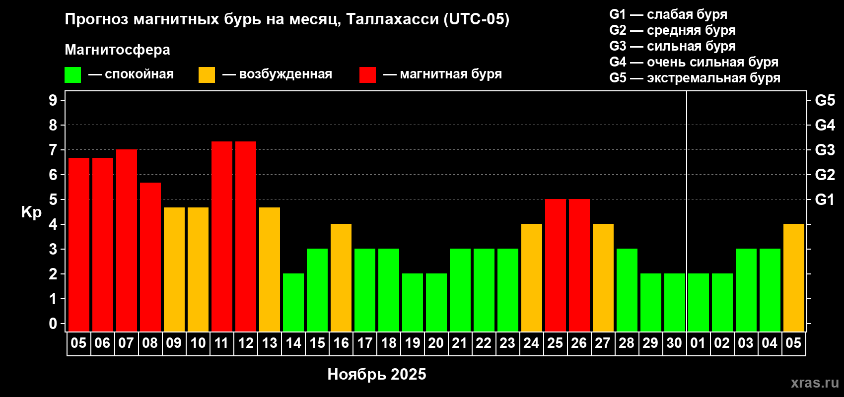 Прогноз магнитных бурь Таллахасси на 5 ноября 2025 года