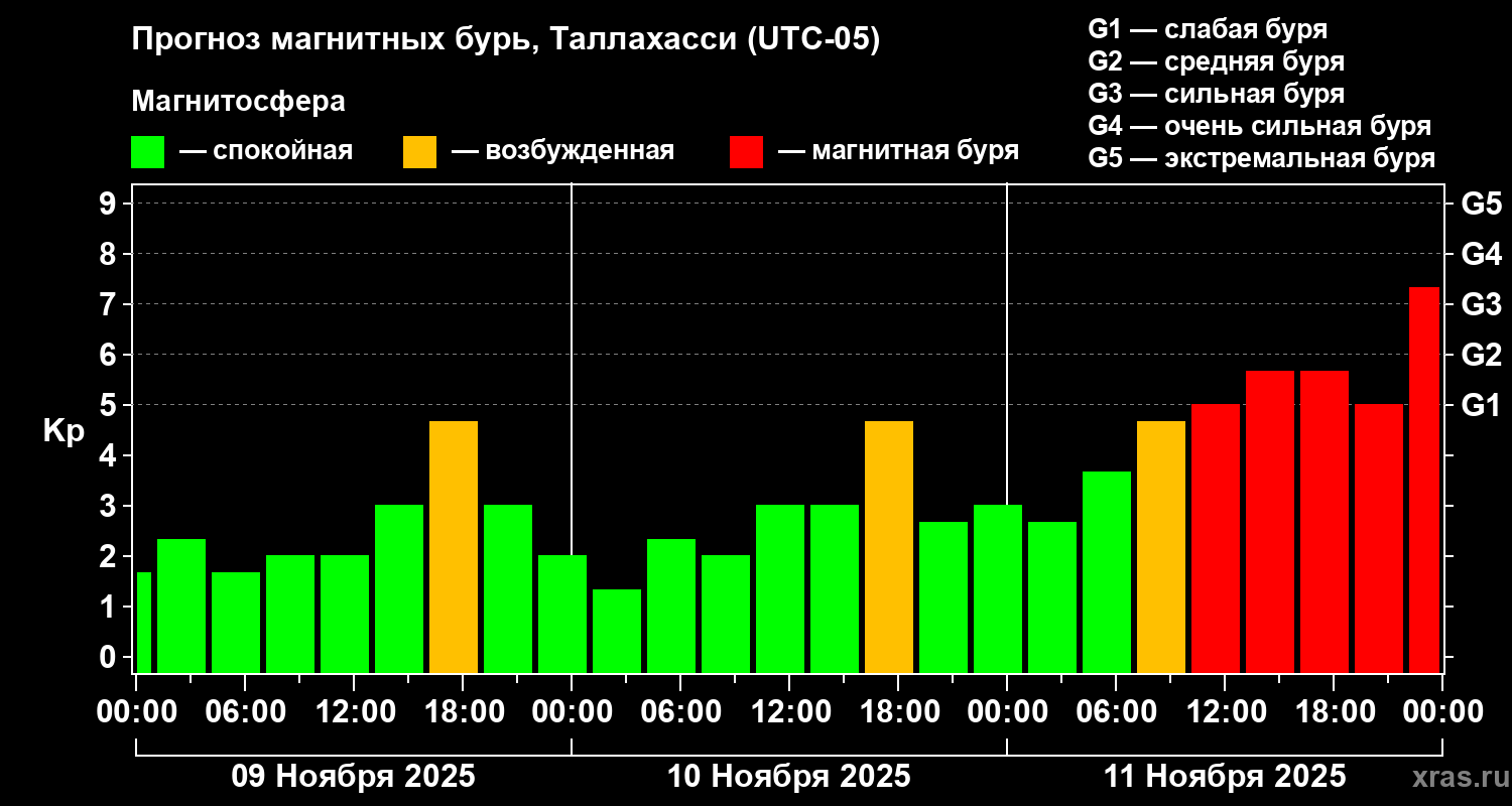 Прогноз магнитных бурь Таллахасси — 9 ноября 2025 года