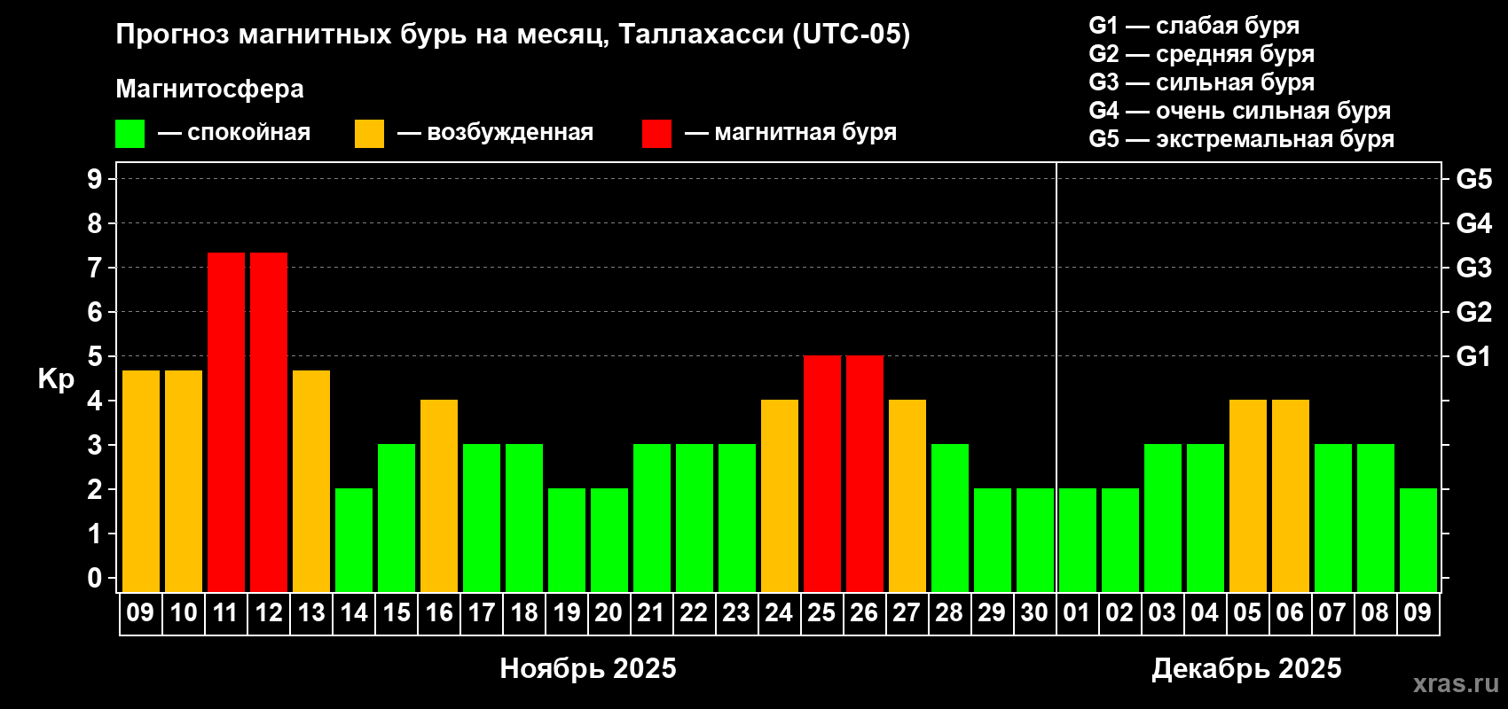 Прогноз магнитных бурь Таллахасси на 9 ноября 2025 года
