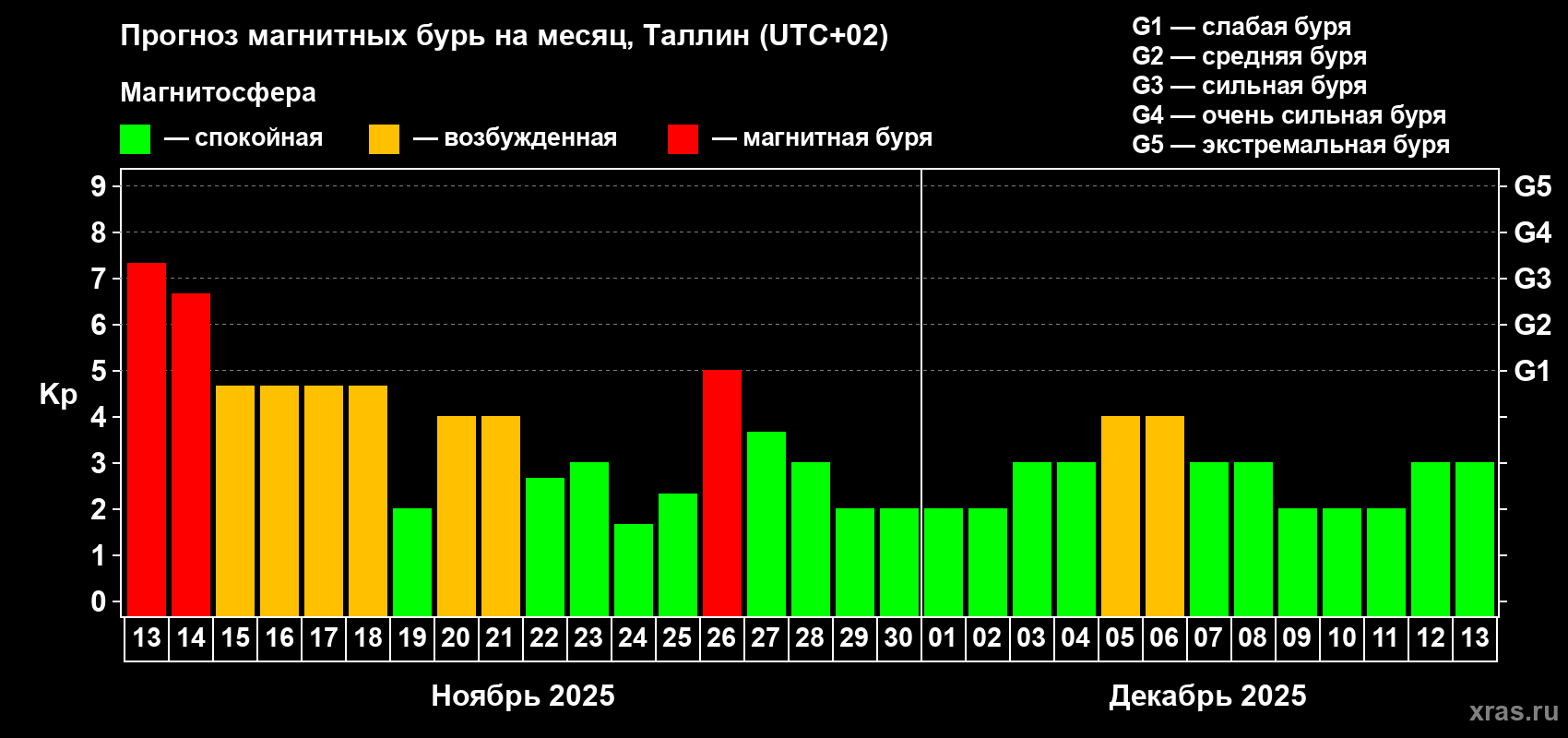 Прогноз магнитных бурь в Таллине — 13 ноября 2025 года
