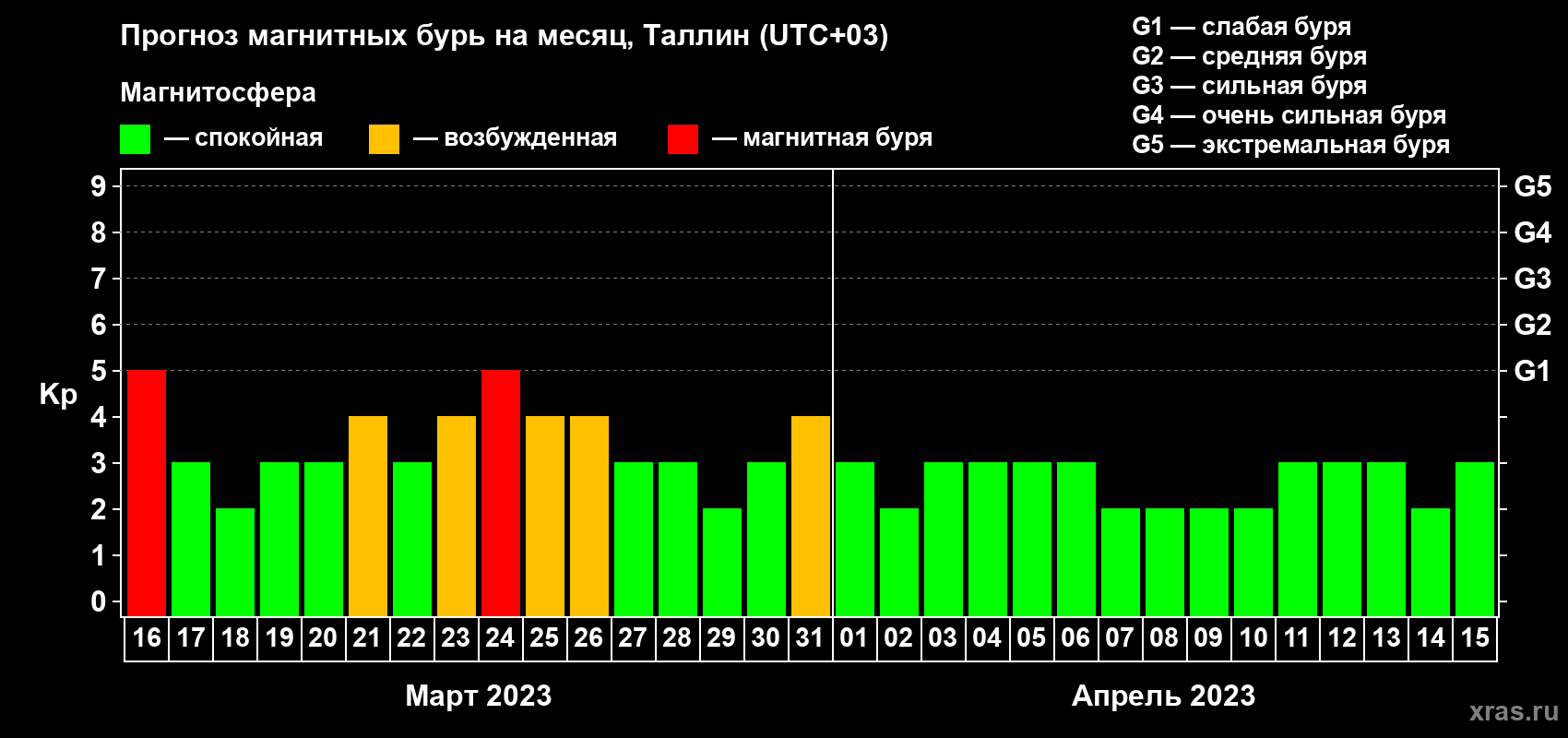 Прогноз магнитных бурь в Таллине — 16 марта 2023 года