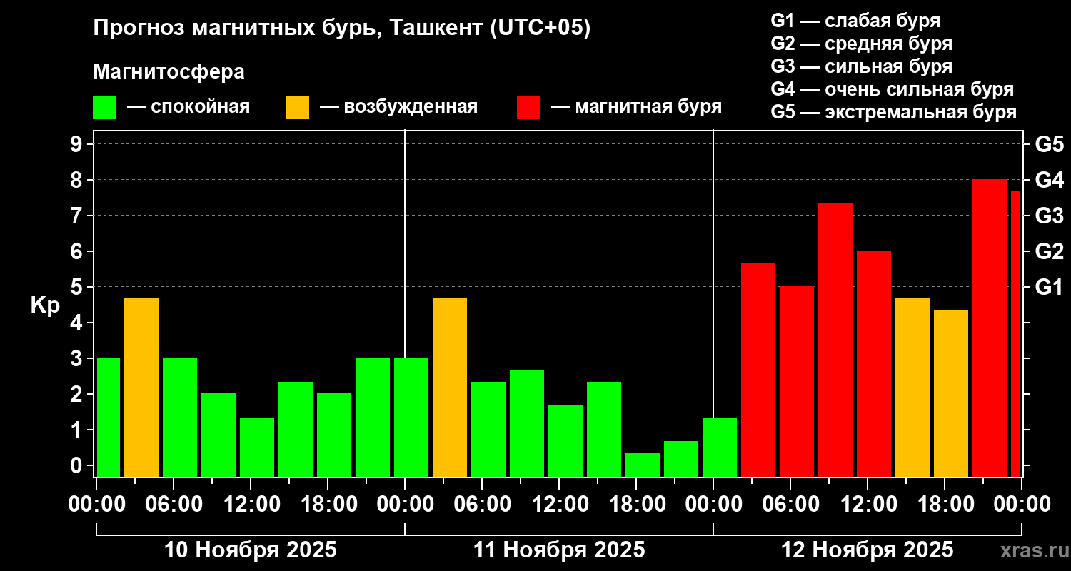 Прогноз магнитных бурь в Ташкенте — 10 ноября 2025 года