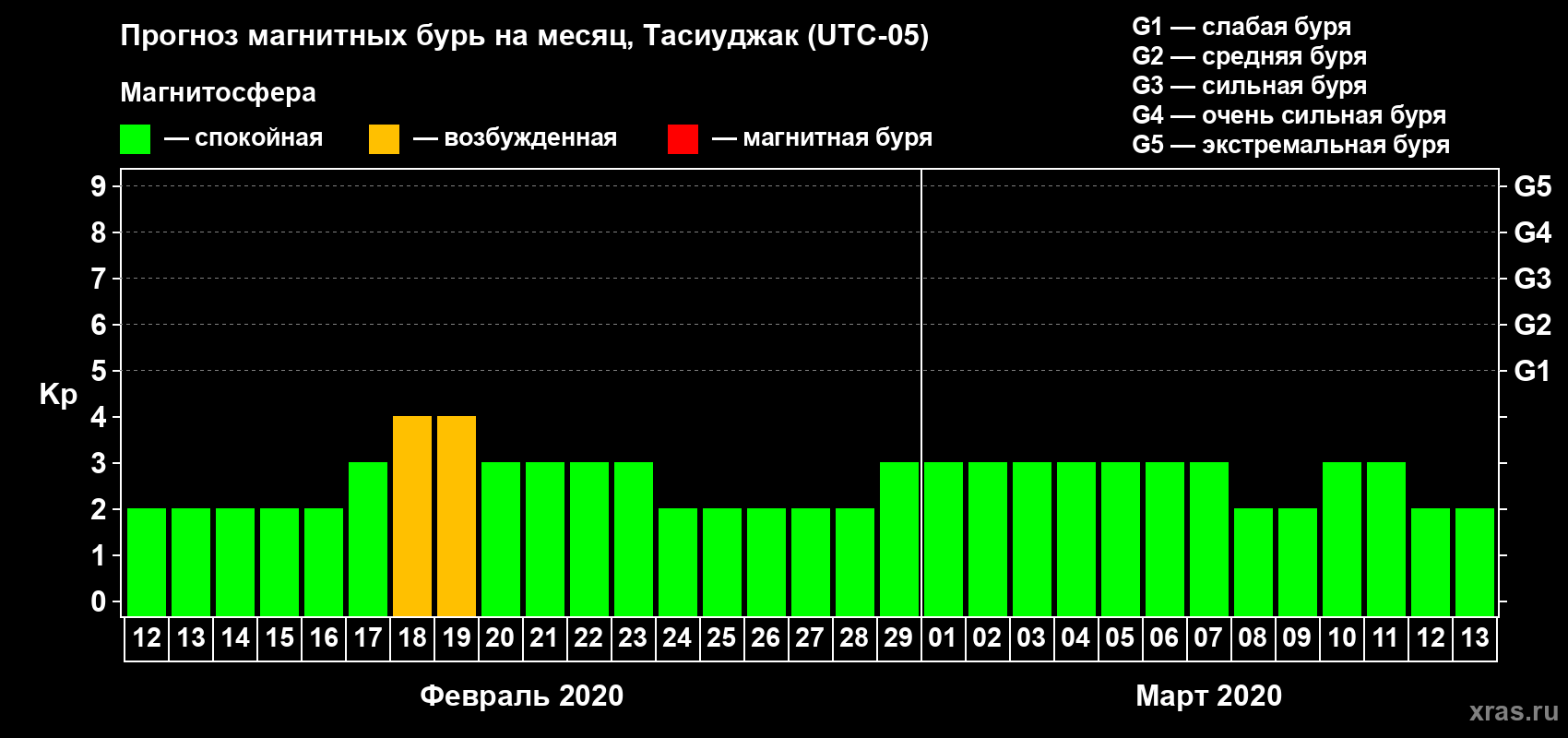 Прогноз магнитных бурь в Тасиуджаке — 12 февраля 2020 года