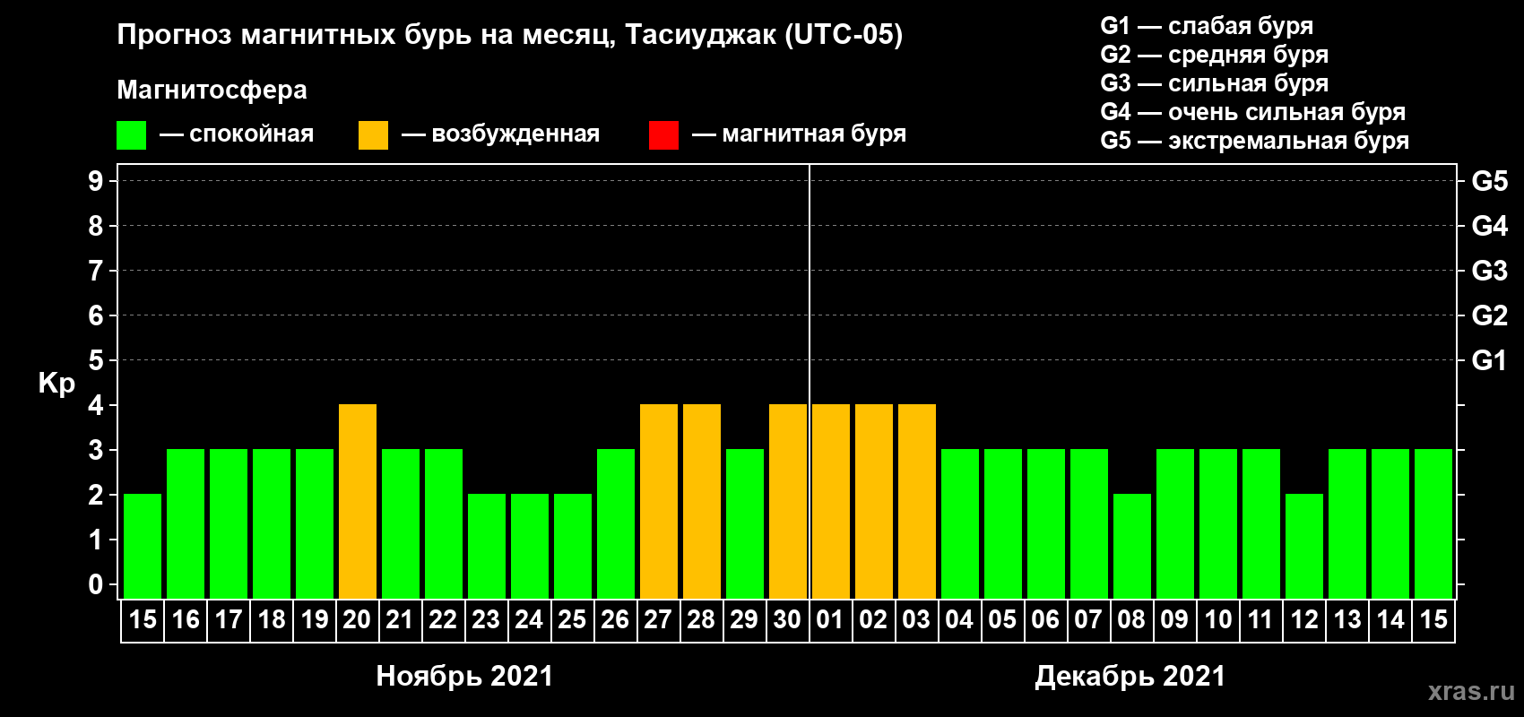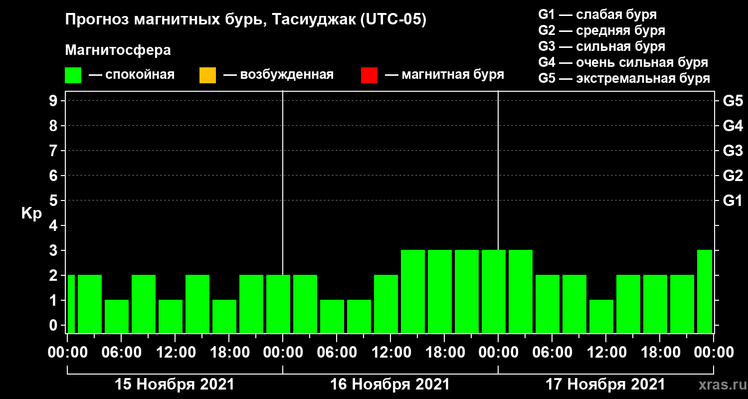 Прогноз магнитных бурь в Тасиуджаке — 15 ноября 2021 года