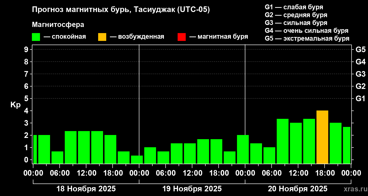 Прогноз магнитных бурь в Тасиуджаке — 18 ноября 2025 года