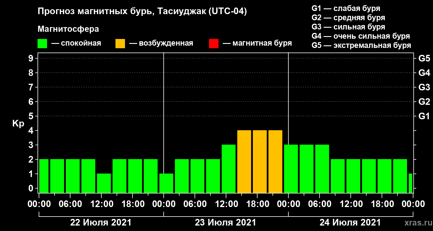 Прогноз магнитных бурь в Тасиуджаке — 22 июля 2021 года