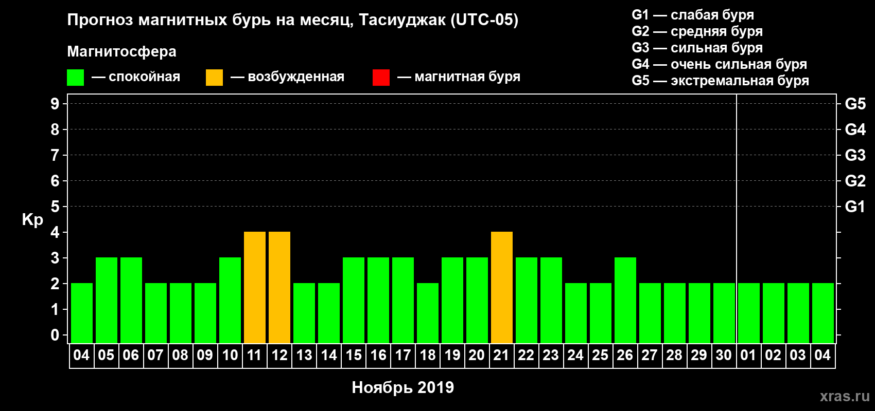 Прогноз магнитных бурь в Тасиуджаке — 4 ноября 2019 года