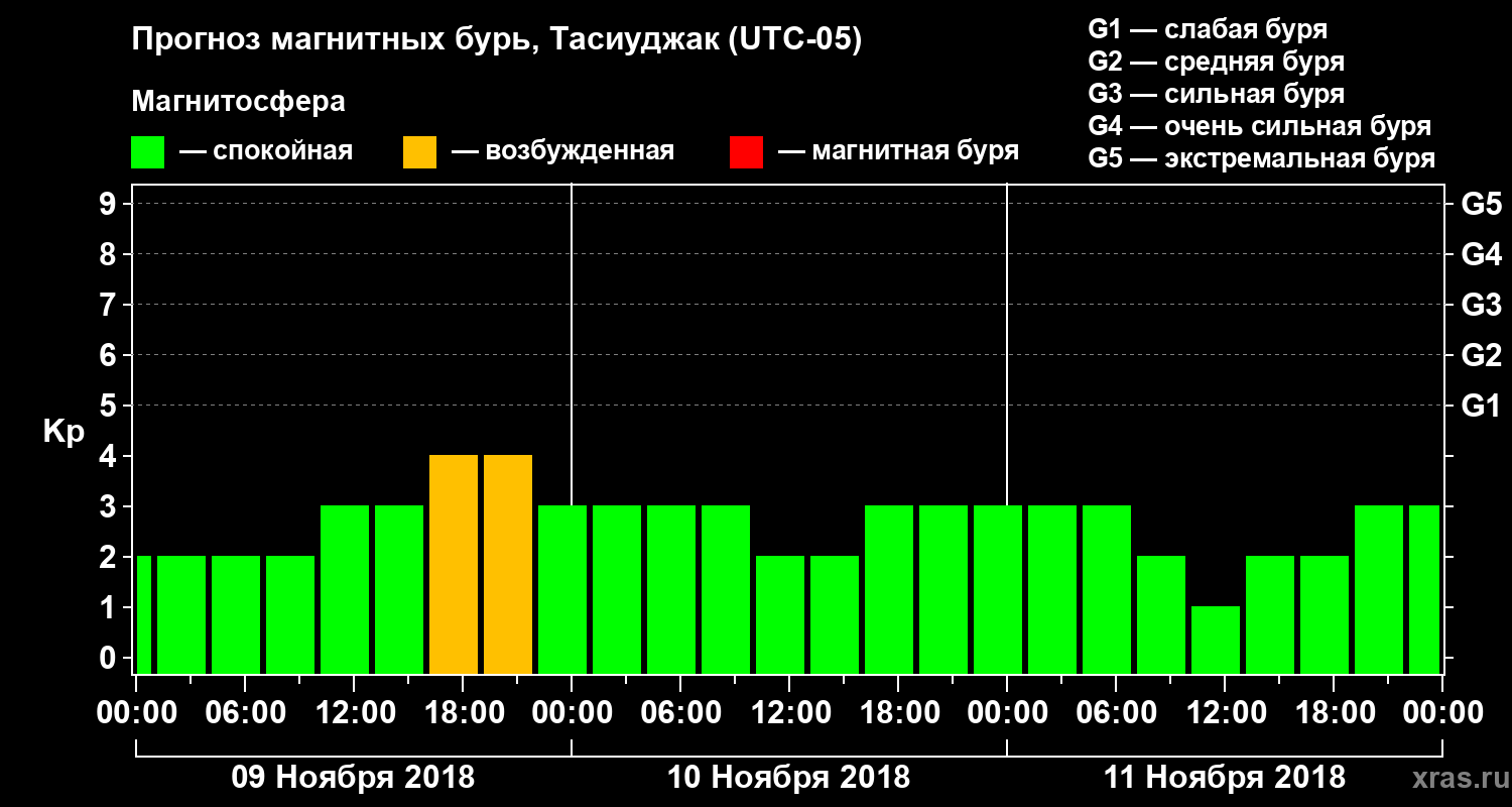 Прогноз магнитных бурь в Тасиуджаке — 9 ноября 2018 года