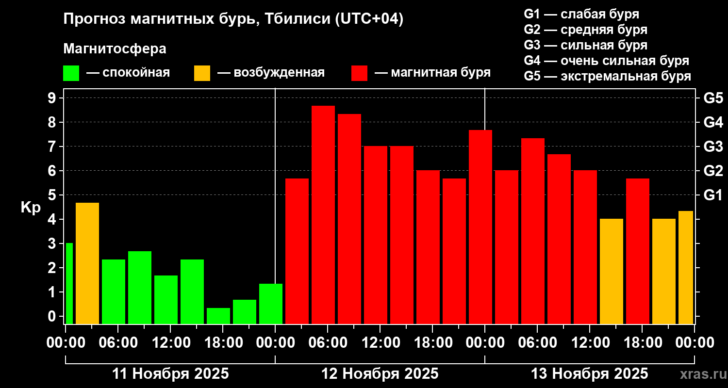 Прогноз магнитных бурь Тбилиси — 11 ноября 2025 года