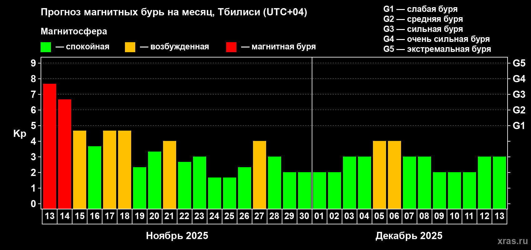 Прогноз магнитных бурь Тбилиси на 13 ноября 2025 года
