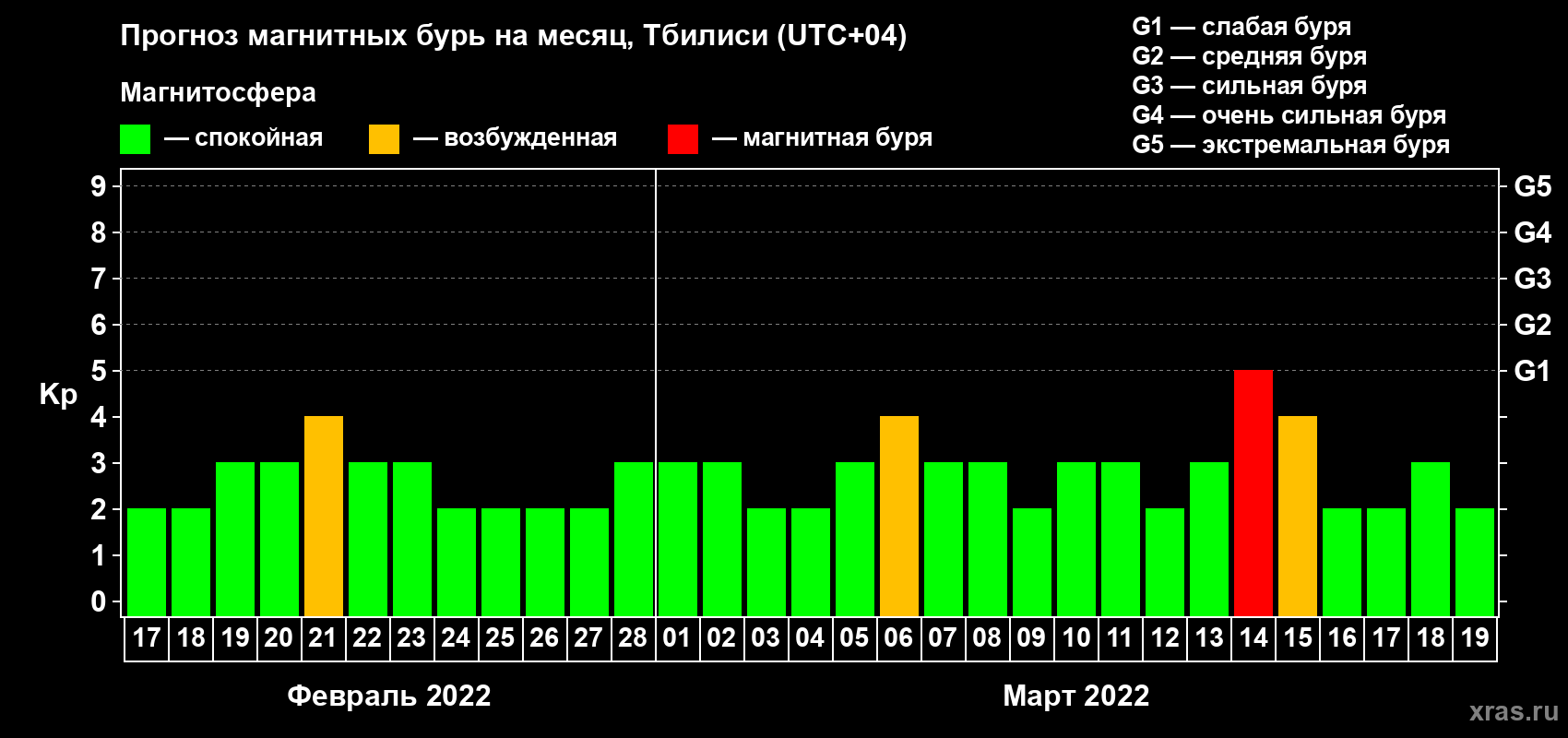 Прогноз магнитных бурь Тбилиси на 17 февраля 2022 года
