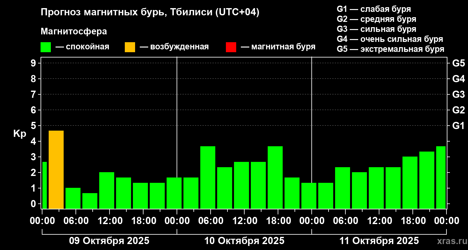 Прогноз магнитных бурь Тбилиси — 9 октября 2025 года