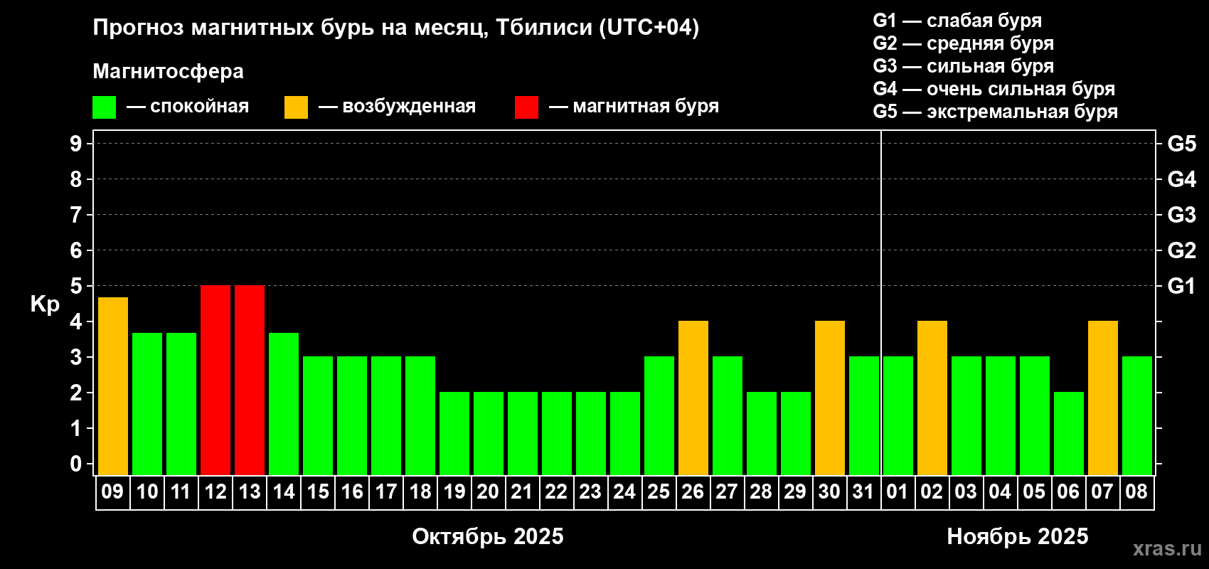 Прогноз магнитных бурь Тбилиси на 9 октября 2025 года