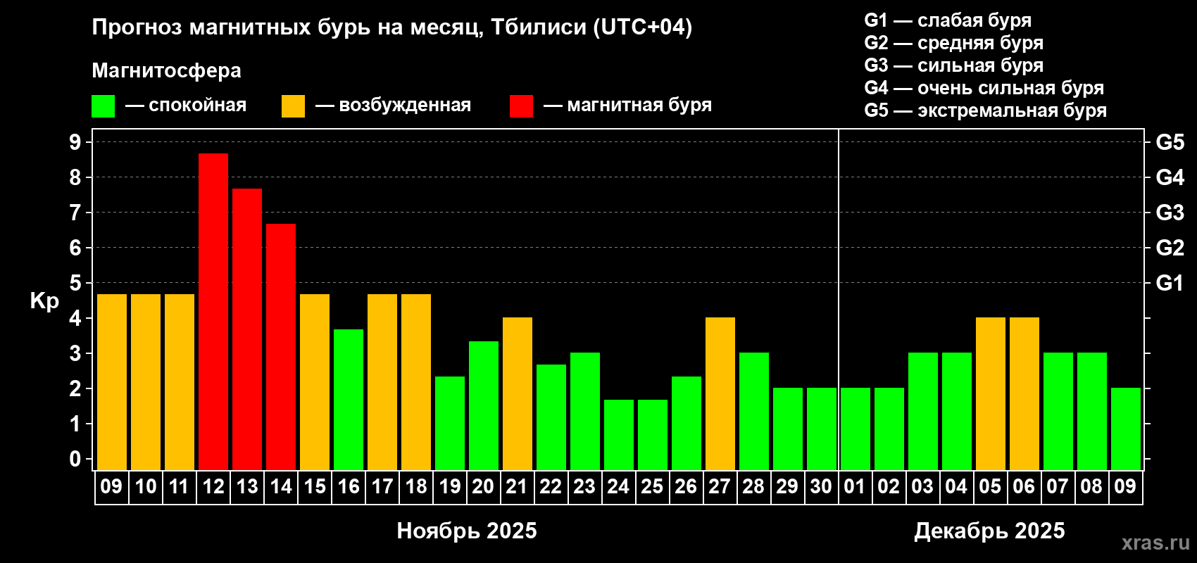 Прогноз магнитных бурь Тбилиси — 9 ноября 2025 года