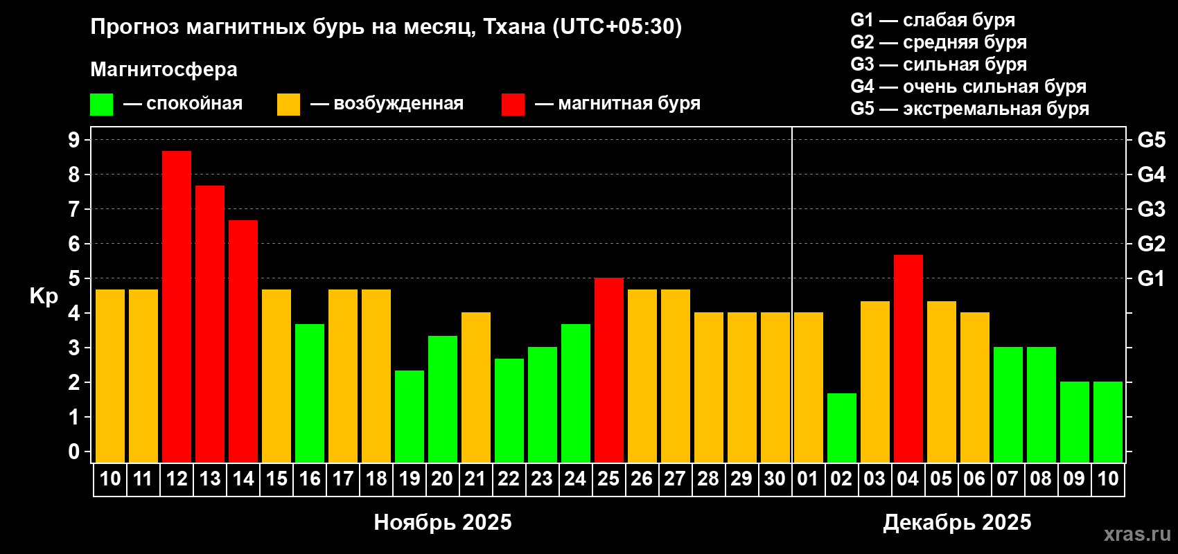 Прогноз магнитных бурь в Тхане — 10 ноября 2025 года