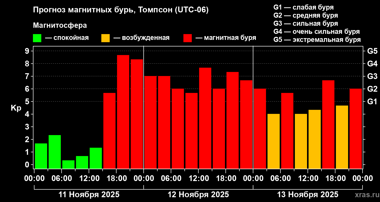 Прогноз магнитных бурь в Томпсоне — 11 ноября 2025 года