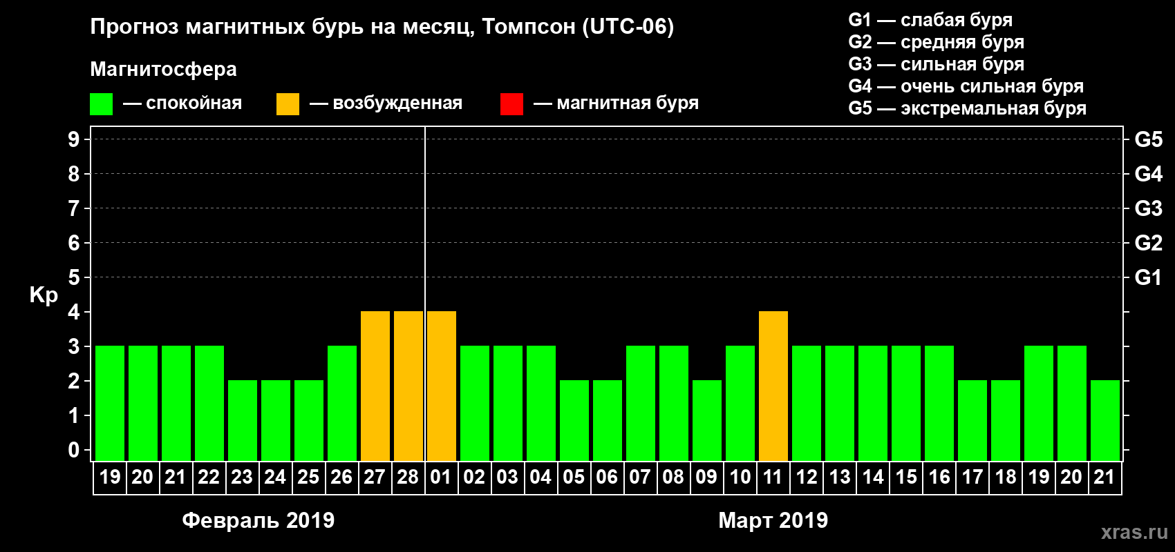Прогноз магнитных бурь в Томпсоне — 19 февраля 2019 года