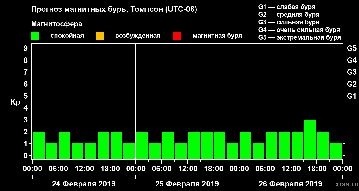 Прогноз магнитных бурь в Томпсоне на 24 февраля 2019 года