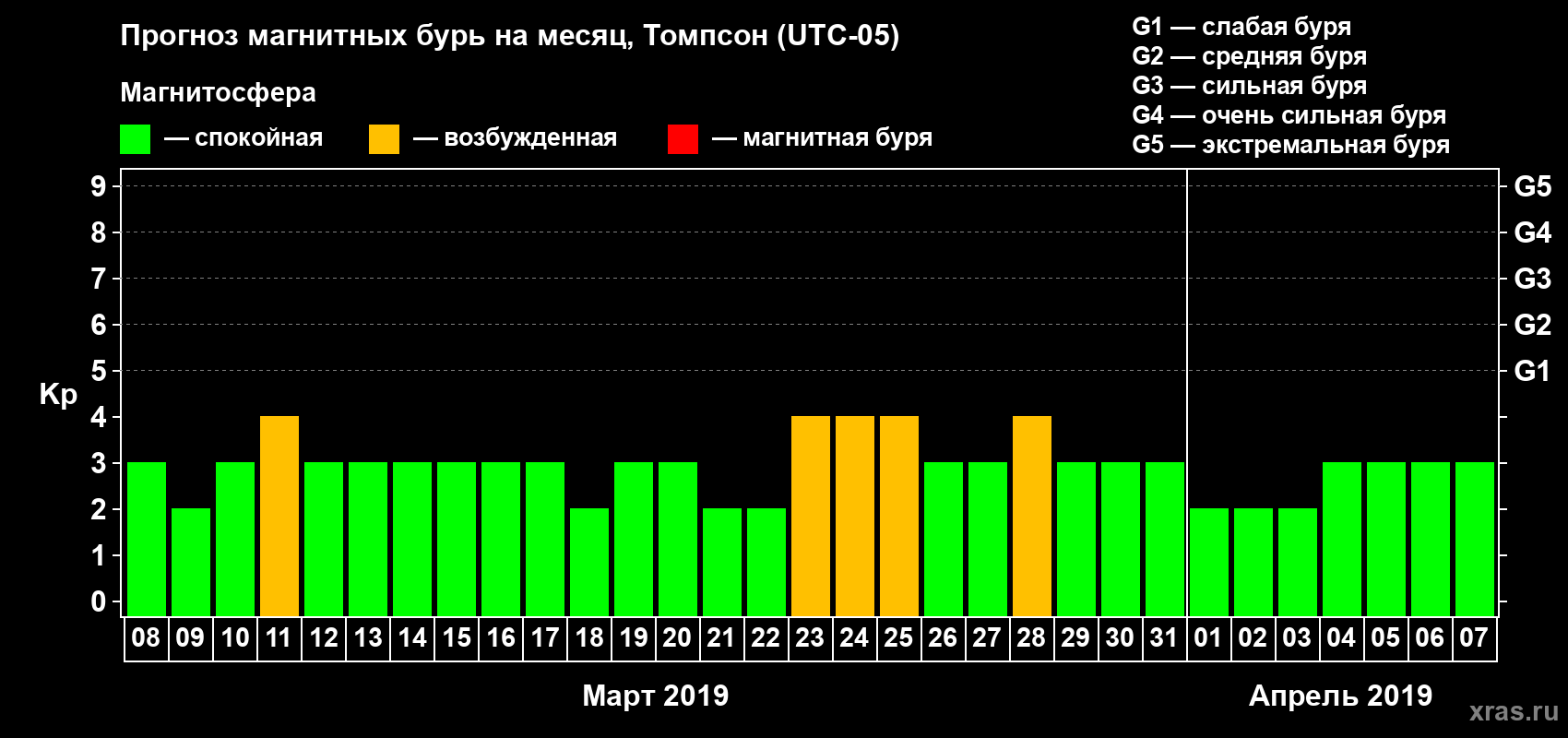 Прогноз магнитных бурь в Томпсоне — 8 марта 2019 года